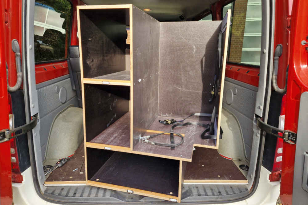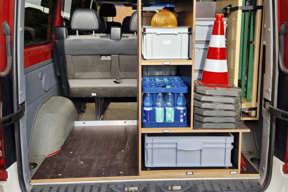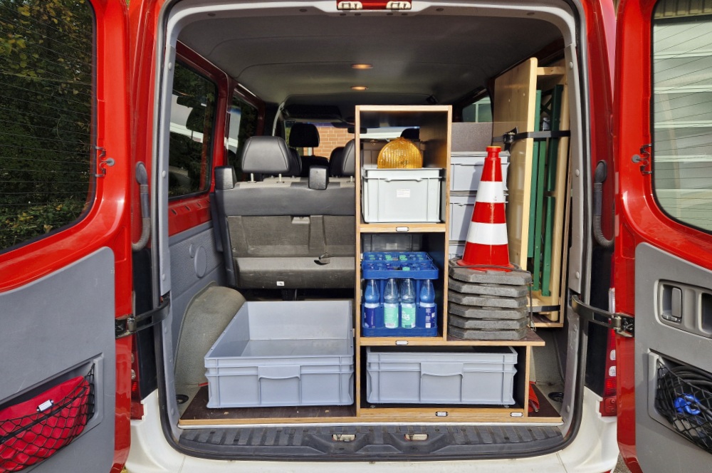 Durch den Einbau eines flexiblen Regalsystems ist es nun möglich, Einsatzmaterialien ordentlich, sicher und griffbereit zu transportieren. Das System sorgt für eine strukturierte Lagerung, sodass alles seinen festen Platz hat und jederzeit schnell verfügbar ist. Zusätzlich wird nun eine kleine Sitzgarnitur mit Tisch (Balkongarnitur) mitgeführt.