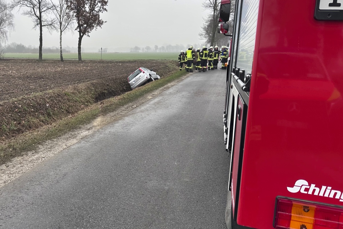 Am Freitag wurden wir gemeinsam mit der Feuerwehr Schwagstorf zu einem Verkehrsunfall alarmiert. Gemeldet war ein Verkehrsunfall, bei dem ein Pkw auf der glatten Bohmter Straße von der Fahrbahn abkam, in einen Graben rutschte und eine Person im Fahrzeug eingeschlossen wurde.