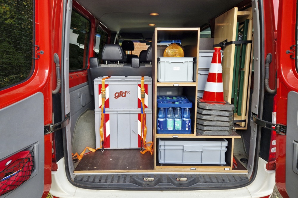 Durch den Einbau eines flexiblen Regalsystems ist es nun möglich, Einsatzmaterialien ordentlich, sicher und griffbereit zu transportieren. Das System sorgt für eine strukturierte Lagerung, sodass alles seinen festen Platz hat und jederzeit schnell verfügbar ist. Zusätzlich wird nun eine kleine Sitzgarnitur mit Tisch (Balkongarnitur) mitgeführt.