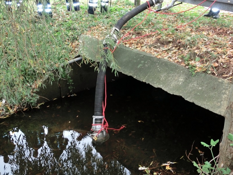 Eine zweite Gruppe beschäftigte sich gleichzeitig mit Möglichkeiten der Wasserversorgung. Dafür wurde zwischen einem südlichen (Bereich Turnhallen, Neubau) und einem nördlichen Einsatzbereich (Schulhof) unterschieden. Hydranten wurden aufgesucht und mögliche Wasserentnahmestellen am nahegelegenen Mühlenbach auf ihre Ergiebigkeit getestet. Außerdem wurde der Mühlenbach mit eigenen Mitteln aufgestaut, um eine Erkenntnis über den Anstieg des Wasserpegels zu bekommen.