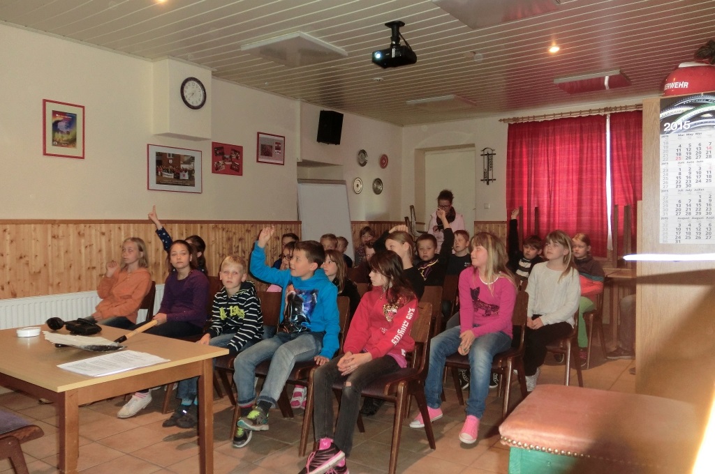 Um 8.15 Uhr trafen die Kinder mit ihren zwei Lehrerinnen am Feuerwehrhaus ein - der Tag bei der Feuerwehr startete. Zum "Aufwärmen" wurden gleich ein paar Fragen von den Feuerwehrkameraden gestellt, die die Kinder alle richtig beantworten konnten. Über das Vorwissen und Interesse der Kinder waren wir sehr beeindruckt.