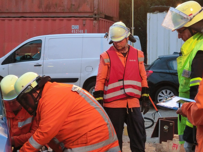 Am Montagabend übten wir auf dem Gelände der Firma Stickelbroeck und Köster Galabau. Als Abschluss des Ausbildungsblocks Technische Hilfe bei Verkehrsunfällen stand eine Einsatzübung auf dem Plan. Das erlernte und aufgefrischte Wissen sollte in der Praxis - unter Ablauf eines realen Einsatzes - getestet und geübt werden. Die Aufgabenstellung sah ein Vorgehen nach den Standardeinsatzregeln patientenschonende Rettung von zwei eingeklemmten Personen vor.